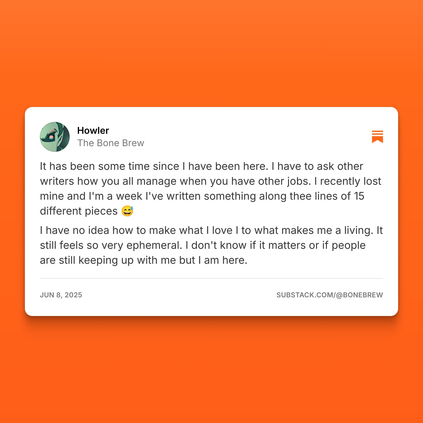 I’ve written enough to cover the next three months. Not because I’m on a productivity kick, but because my job’s gone, and this is what I do. Not when I feel inspired. Not when the algorithm is ripe. Always. It’s the only constant.