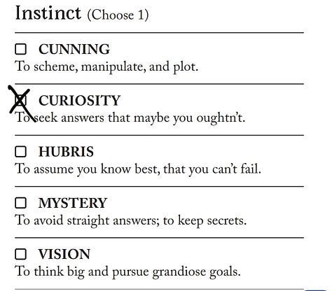 Now before we dive into the first session proper we have some questions to mull over. The answers of which we can find out through play. Stonetope Prep encourages you to create a tally of questions you update session over session. One thing I rather like about this is that it offers the opportunity to bring in Mythic to answer some of these things, or come up with further detail for leading questions which is highly encouraged.
