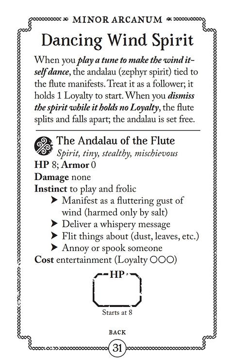 Zaj has two minor Arcana the first of which has granted them the title of Speaker. A long, thick flute carved of burnt ash wood, with a thin but visible crack along the underside. It easily catches the wind and makes a delighful sound. One the very wind delights in, when playing Zaj can command The Andalau of the wind. A feat for such mischievous spirits.