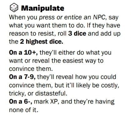 Take the Risk is the most common move our characters will make. Normally we would discuss with the GM about what we’re trying to do and what could go wrong, even if we succeed. These could be complications, downsides, additional cost, or maybe we can’t get it all in one go. As this is a solo game I'll be using Mythic for a lot of this GM discussion part of things.