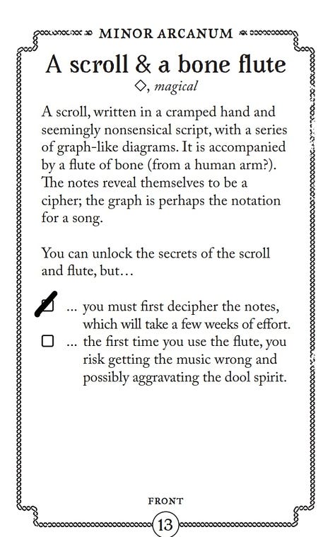 The second is another flute made of a polished alabaster bone. It could be from a beast but it looks far too humanoid to Zaj’s trained eye. They were able to decipher the weird runes carved into it and realize it, like the wooden flute, is a spirit caller. Yet none heeds their call, so Zaj practices the song on their other flute for fear of upsetting the unknown Spirit.
